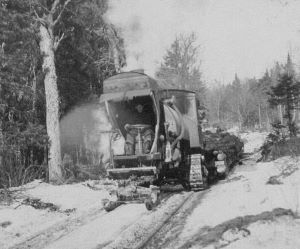 Morton Cowan’s lecture and slide presentation describes logging procedures from colonial times to the present day, beginning with primitive cutting and transporting methods, including the mast trade with Britain. Cowan discusses developments from log drives and steam-powered log haulers to recent innovative wood products and industrial advancements in tree harvesting.